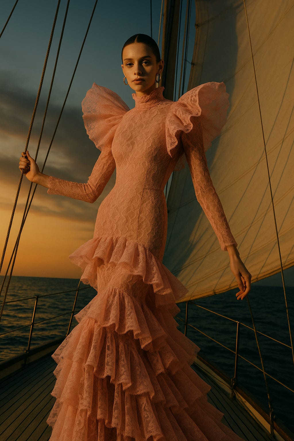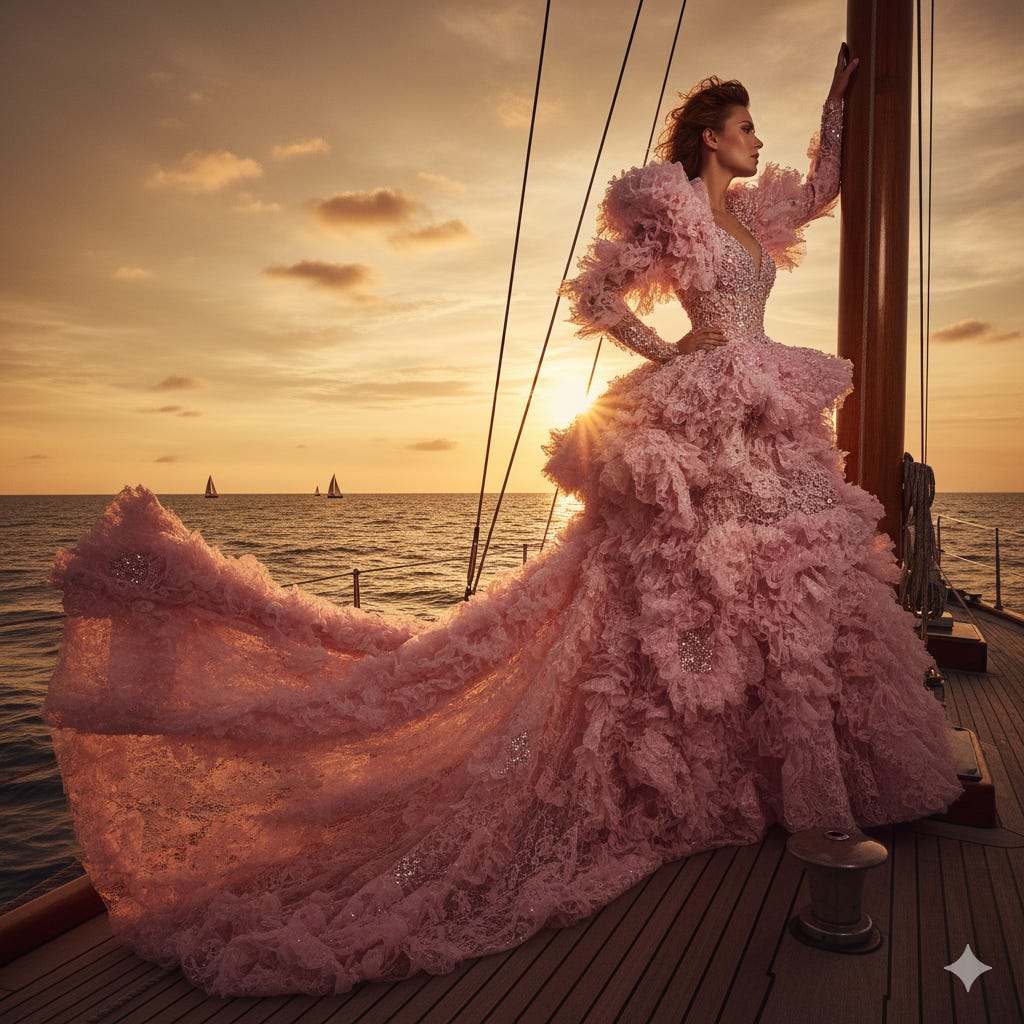 šŖ Prompt: A high-fashion editorial photo of a model in an avant-garde pink lace gown, standing on a sailboat at sunset, cinematic lighting, Vogue-style.