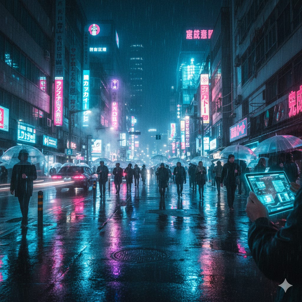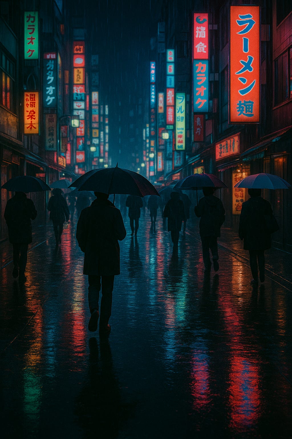 šŖ Prompt: A rainy Tokyo street at night, neon signs, reflections in puddles, people with umbrellas, cinematic atmosphere, cyberpunk style.