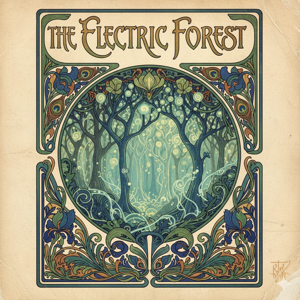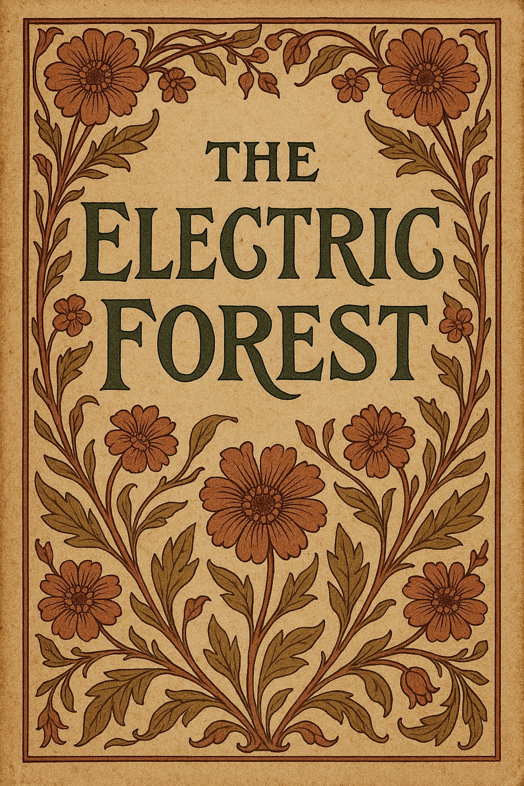 šŖ Prompt: A vintage book cover with the title āThe Electric Forestā, stylized type, floral borders, aged paper texture, Art Nouveau style.