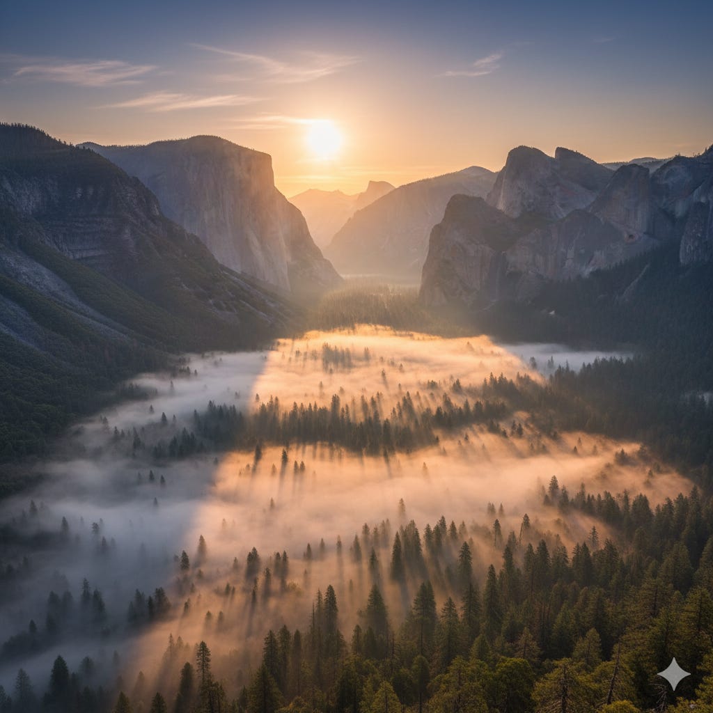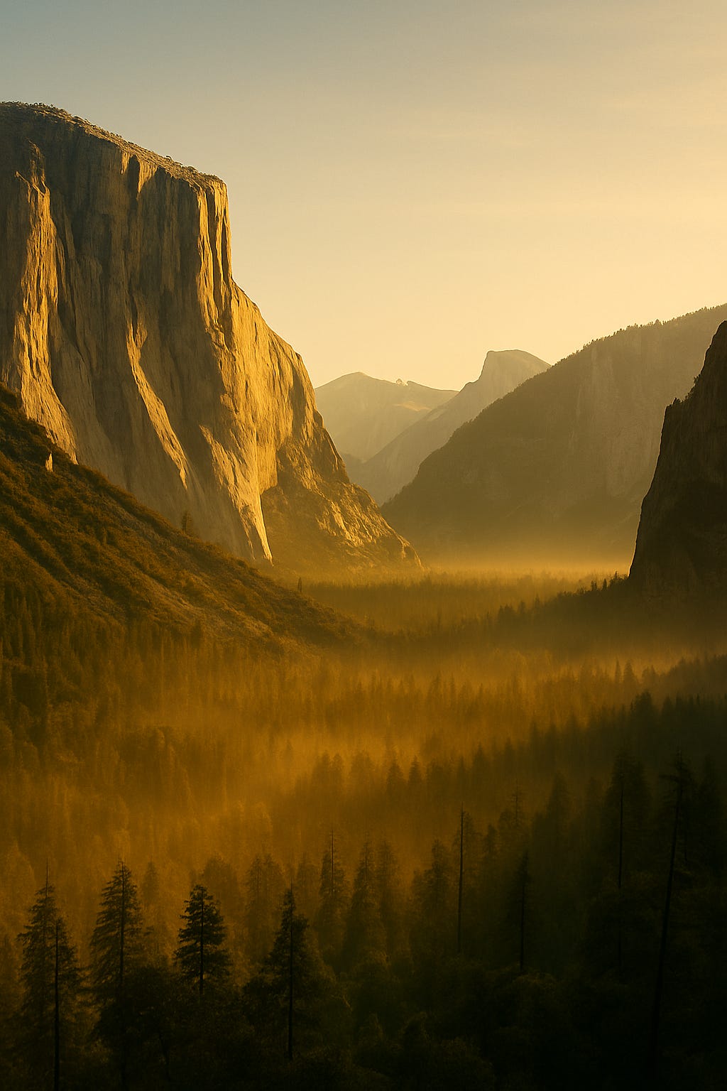 šŖ Prompt: Yosemite Valley with El Capitan and Half Dome visible in the distance, early morning fog, golden sunrise light casting long shadows, realistic National Geographic-style photo.