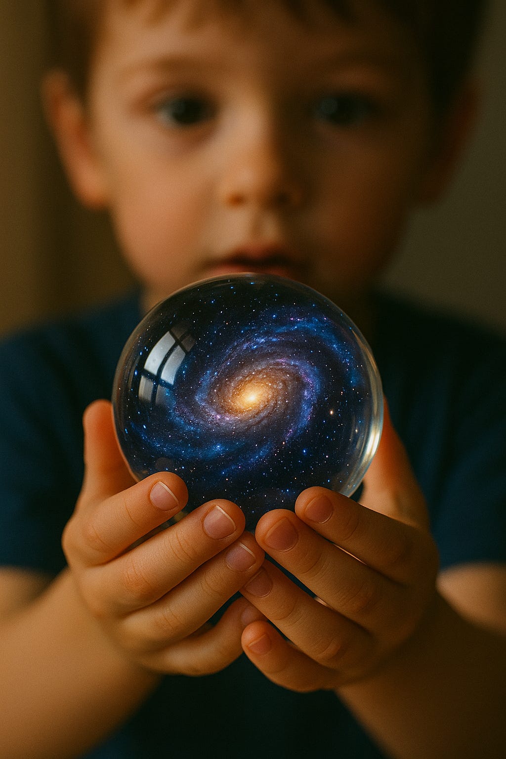 šŖ Prompt: A child holding a glass orb with a tiny galaxy inside, light reflections on the orb, accurate hand anatomy, shallow depth of field.
