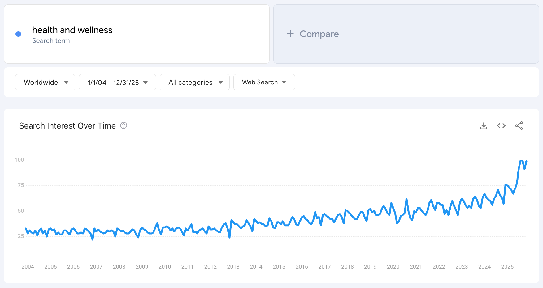 Health and wellness is a major trend right now. Search interest has been rising for years as it becomes increasingly important to the average person.