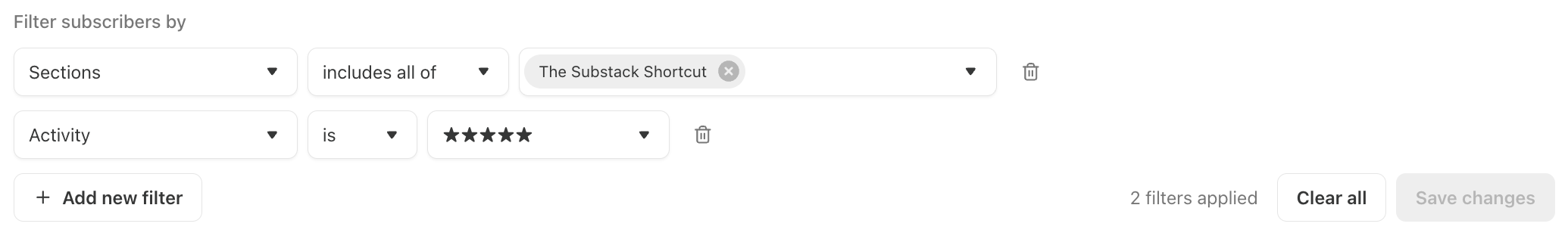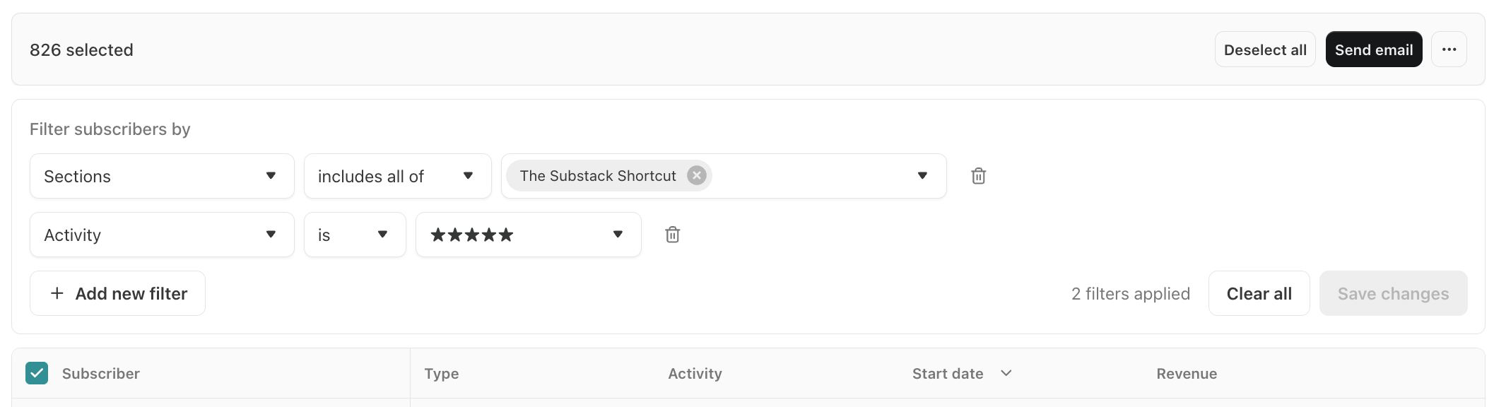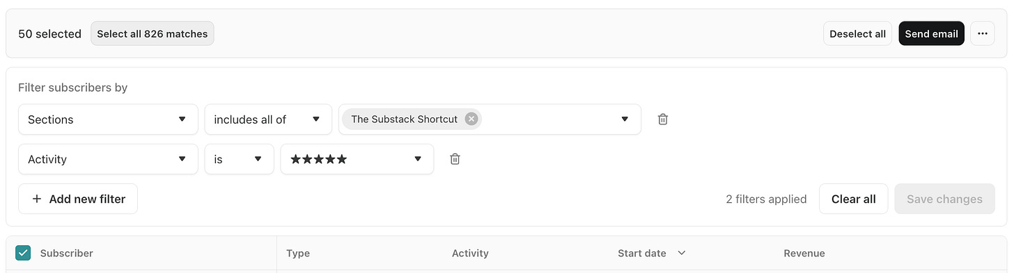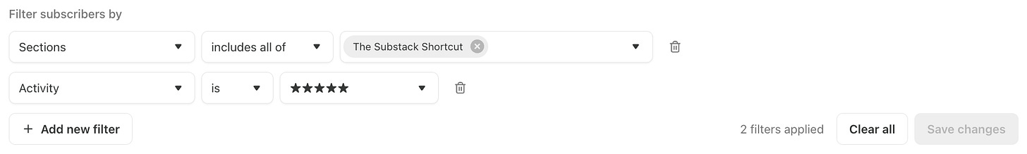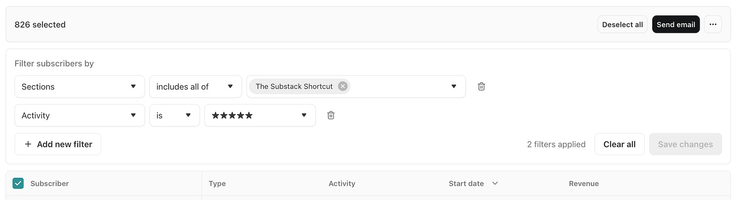 For example, if I wanted to run an audience survey to get input on what topics the most engaged subscribers to my Substack Shortcut are interested in, I would filter my subscribers in this way: