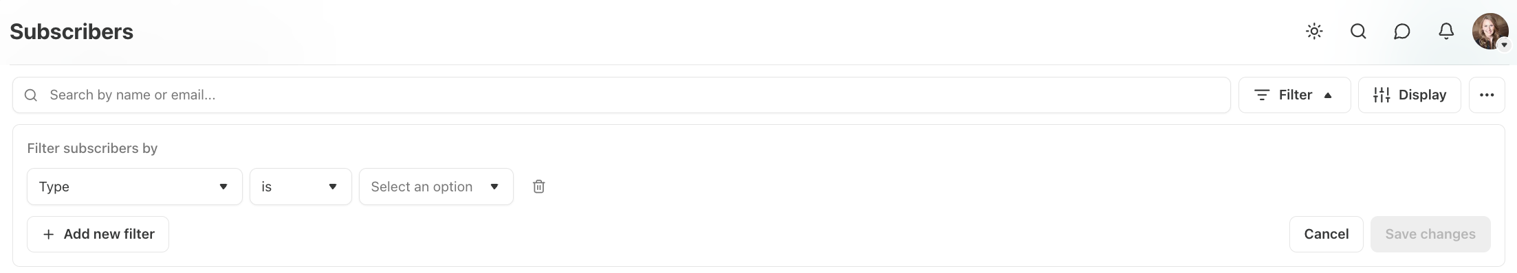 In the top right of your Subscribers page, you’ll see a “Filter” button. Click on it to expand the filter menu.