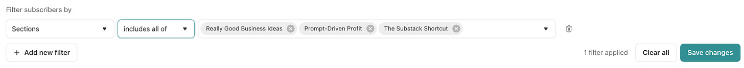 “Sections” filter type + “Includes all of” + “The Substack Shortcut” (my section for Substack content).