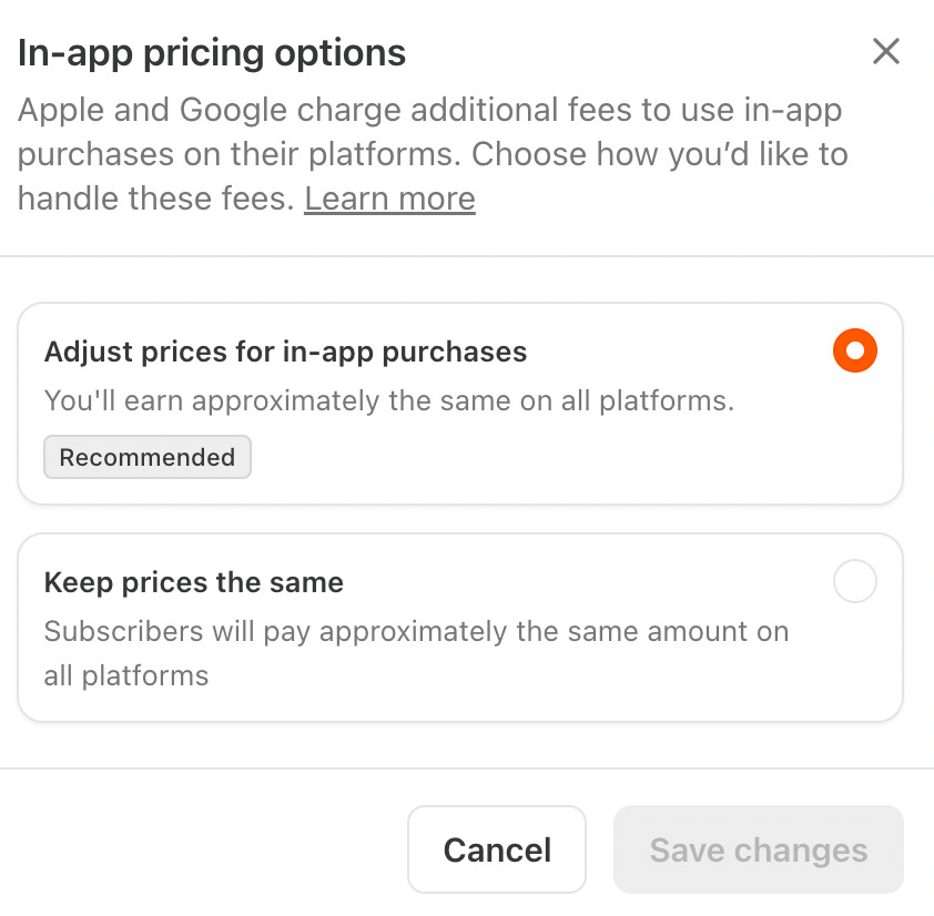 In August 2025, Substack introduced adjusted pricing to protect writer margins. By default, Substack automatically inflates subscription prices inside the mobile app to cover the store’s commission, essentially passing the “tax” directly to the reader so the creator doesn’t lose any money. (Writers can opt out if they’re willing to absord the cost themselves.)
