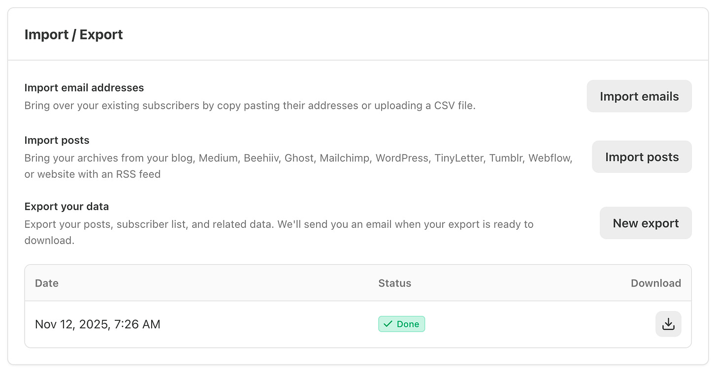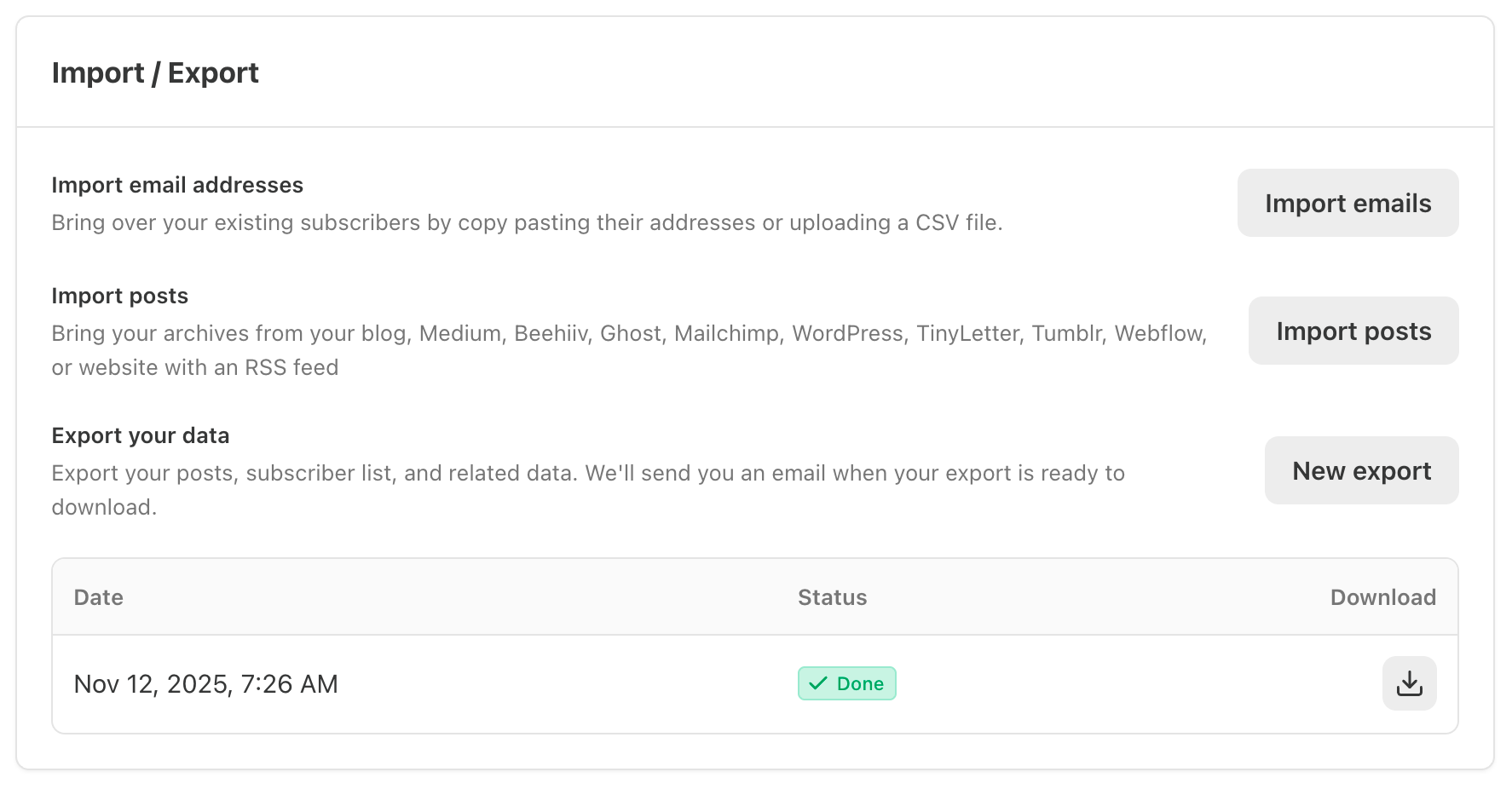 Next, find “Import / Export” on your Settings sidebar. Then click “New Export” to start the export process. It’ll take a few minutes for Substack to build your export ZIP file, then click the download icon.