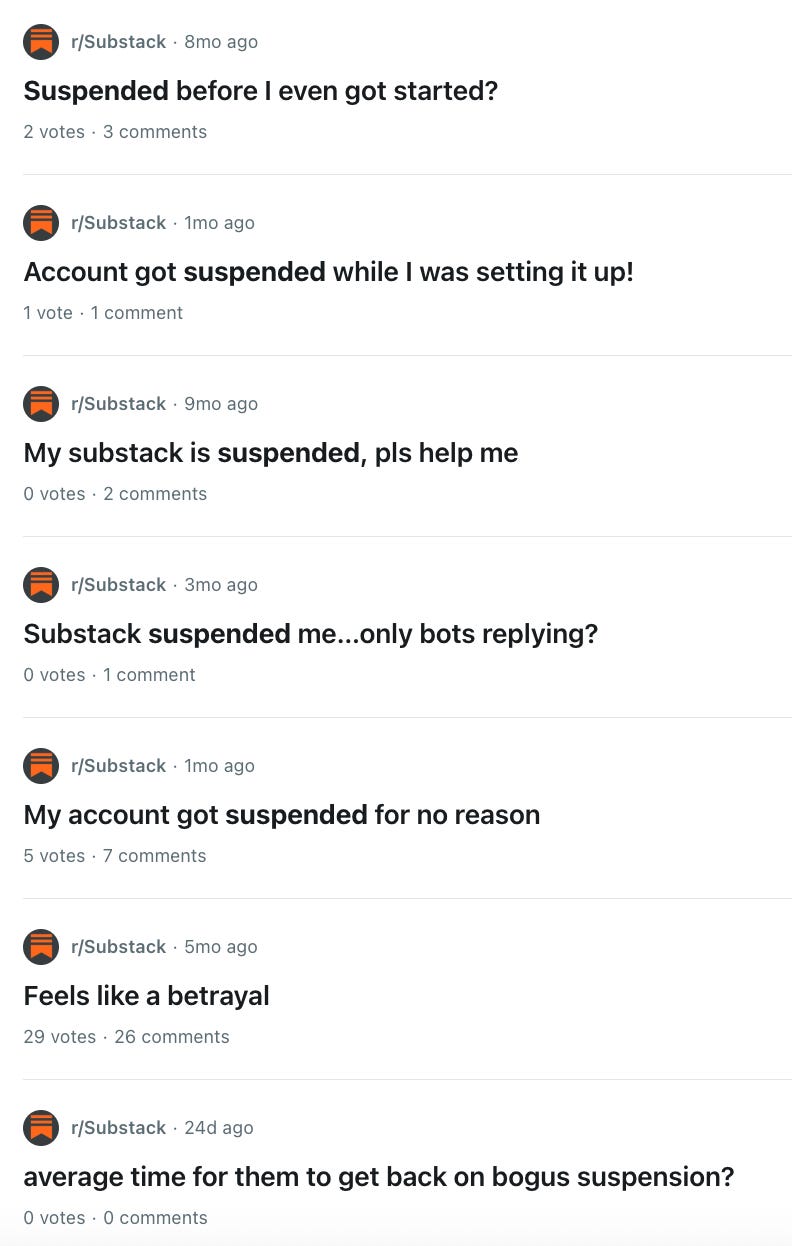 Reddit is full of people reporting that their accounts were suspended. While some of these people are likely bad actors who violated Substack’s terms of service, mistakes do happen. Sometimes people don’t even realize they did anything wrong; other times, Substack may have made a mistake. Unfortunately, regardless of the cause, most are unable to undo the suspensions.