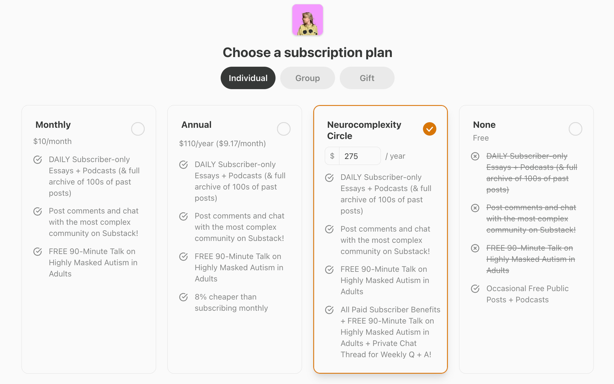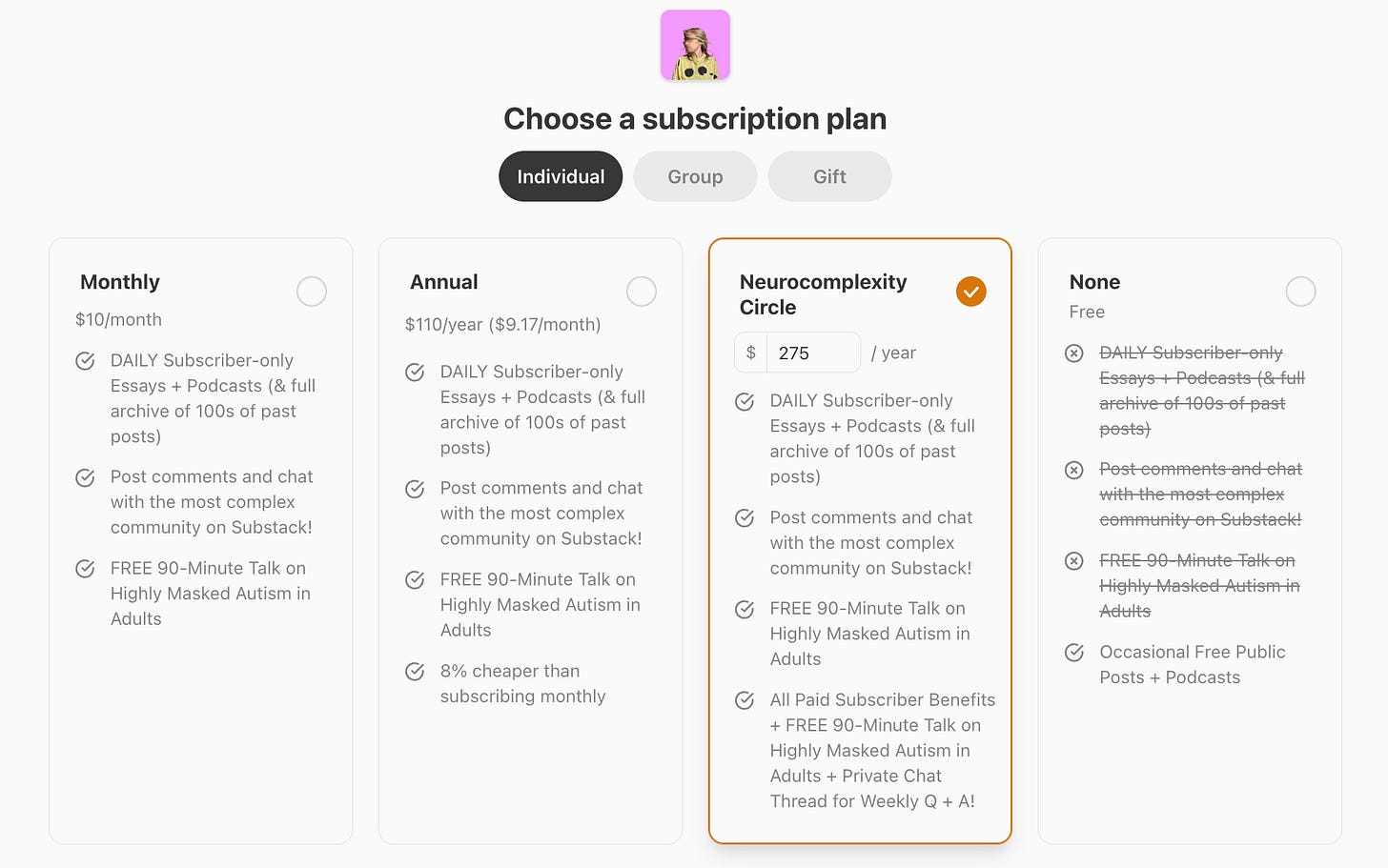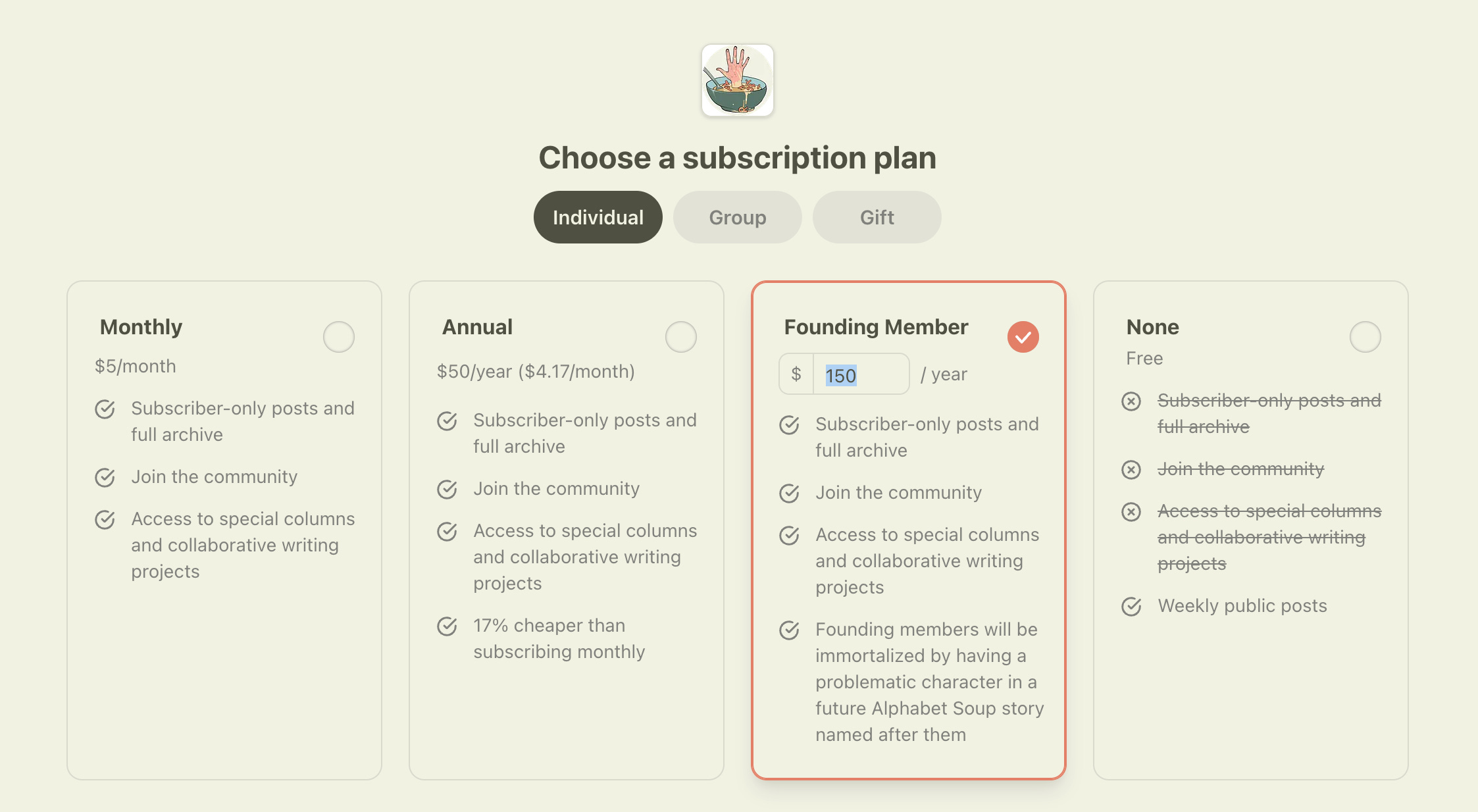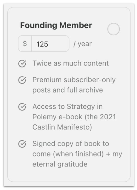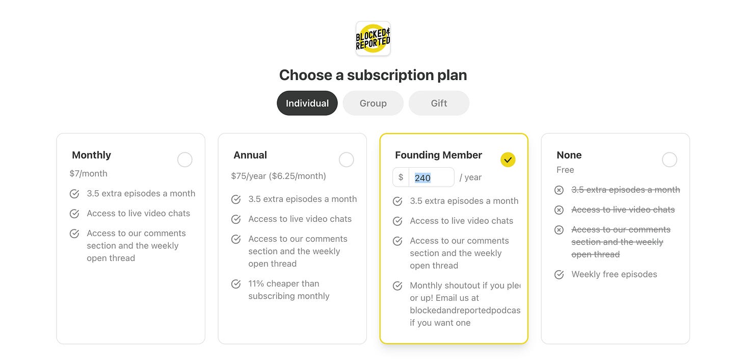 Founding Member Tier: This is the highest level of support. It’s intended for our most loyal and generous readers who want to make an extra contribution. This tier often includes all the perks of the Annual plan, plus an extra special reward (like a one-on-one consultation, exclusive merchandise, or significant recognition) to acknowledge their profound support. This plan is optional and many publishers choose not to offer it.