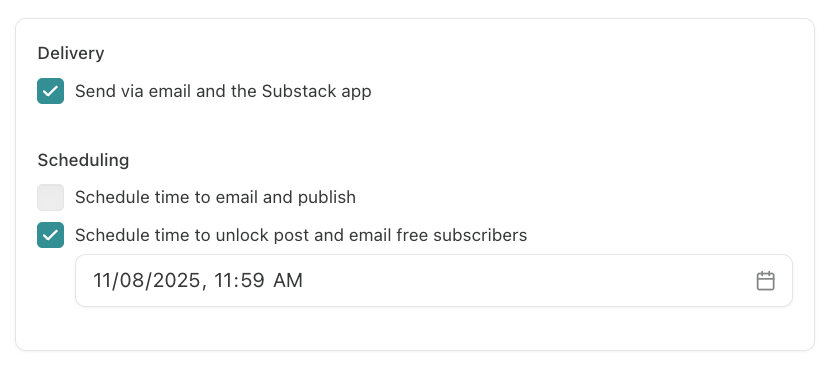 If you want to unlock your paid content after a certain date, you can manage this on a post-by-post basis in your scheduling settings. When you’re ready to publish a post, click Continue, scroll down to Scheduling, click “Schedule time to unlock post and email free subscribers,” and choose the date you want the post to unlock.