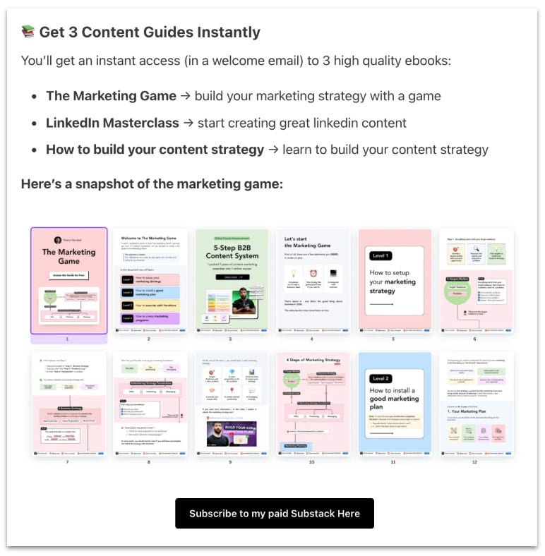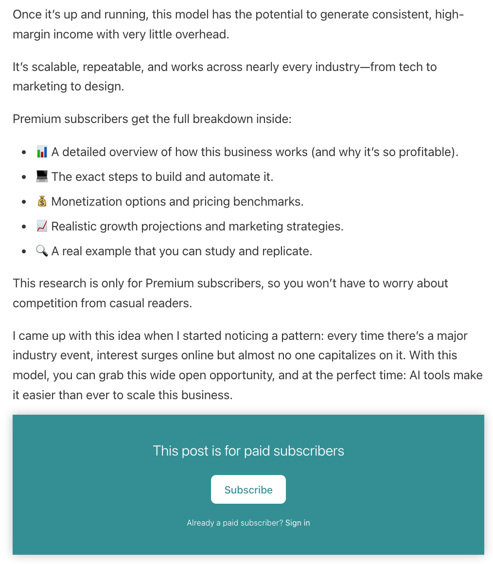 This is typically what I do for Really Good Business Ideas. Most articles include a preview section where I provide value to free subscribers and a clear overview of what to expect behind the paywall, followed by a paywalled section that provides additional value to Really Good Business Idea Premium subscribers.