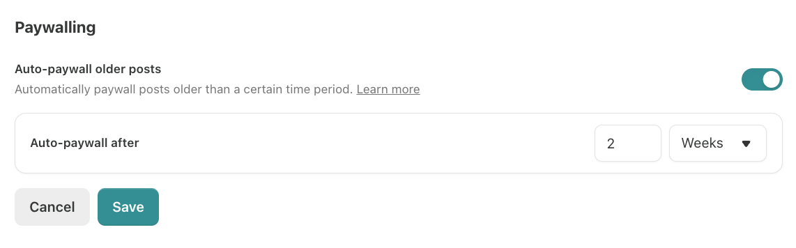 If you want to try paywalling after a set period, you can easily automate this from your Substack publication’s dashboard. Visit Settings → Payments → Paywalling, toggle on Auto-paywall older posts, and select your timeframe.