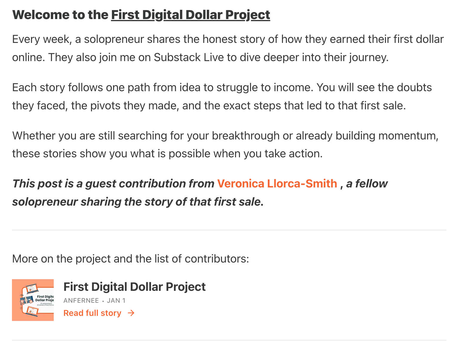 Solopreneur Code is a weekly newsletter that helps solopreneurs work smarter and earn more using AI. The publication runs a guest series in which guests share the story of how they earned their first dollar online. Every post follows the same structure: three paragraphs of boilerplate copy introducing the series, a bold italic attribution line crediting the guest, an embedded link card pointing back to the project intro, a featured image card with the guest's name and photo, the guest's story, their sign-off, another link card, and a subscribe section. That's a lot of repeated scaffolding to rebuild from scratch each time. A template can handle all of it, so the only thing that actually changes post to post is the guest's story itself.