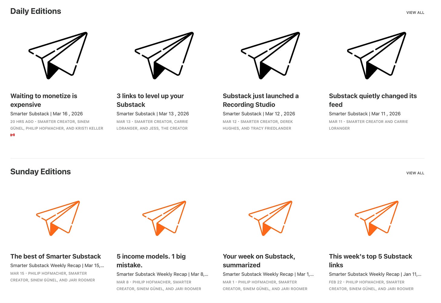 Smarter Substack is a daily curation newsletter that delivers three Substack growth resources to subscribers every weekday, plus a weekly Sunday recap. Each format has its own distinct look. The daily posts use a black and white paper plane header; the Sunday edition uses an orange one. Both formats include consistent section headers, emojis, dividers, subscribe buttons, recurring copy, and a sign-off. A template for each means not having to set up from scratch every time. Simply open the template, update the content, and publish.