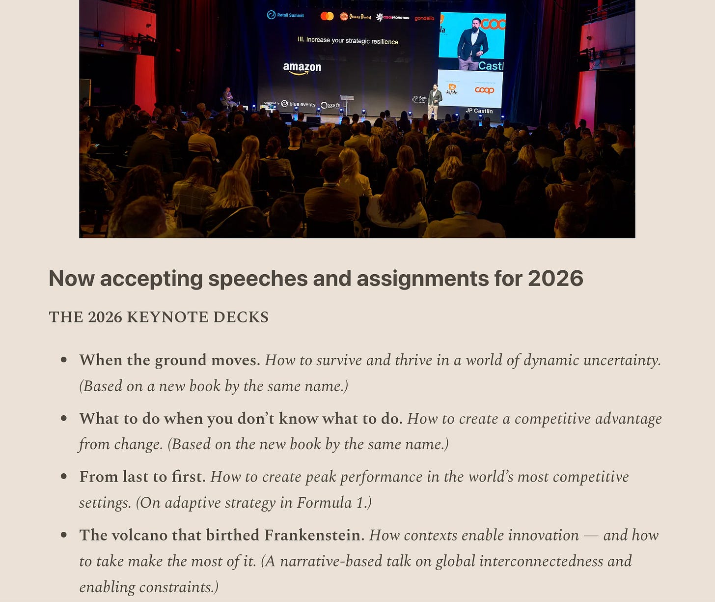 Strategy in Praxis is a biweekly newsletter on strategy and uncertainty. Every issue opens with the same salutation, the same one-line greeting, and then a full services section pitching keynote decks and consulting offerings before the main content begins. The keynote titles, domain list, format list, and contact line are all identical from issue to issue. That section is essentially a standing ad for an active speaking-and-advisory business. A template lets you dial in your pitch once and easily reuse it again and again.