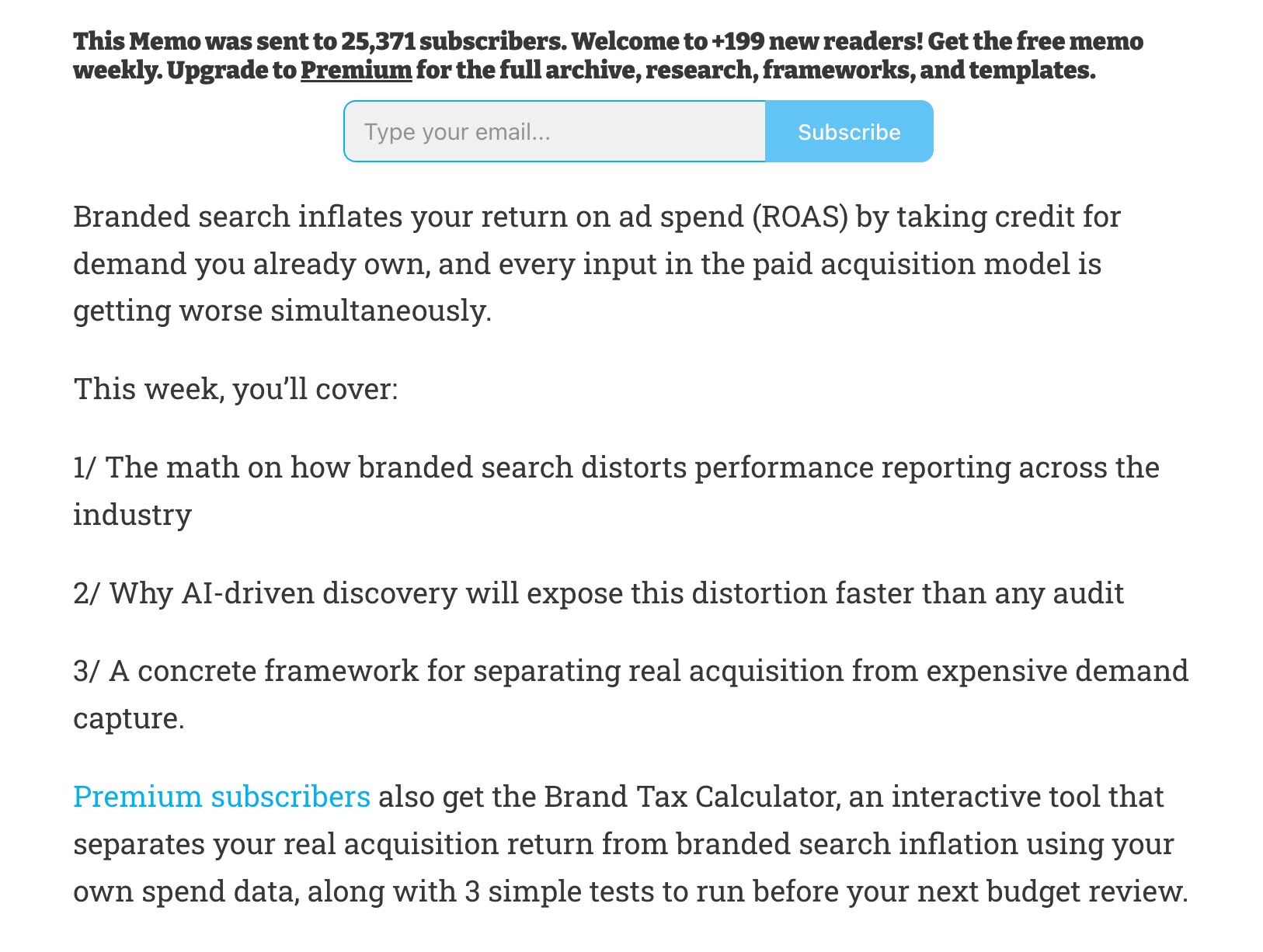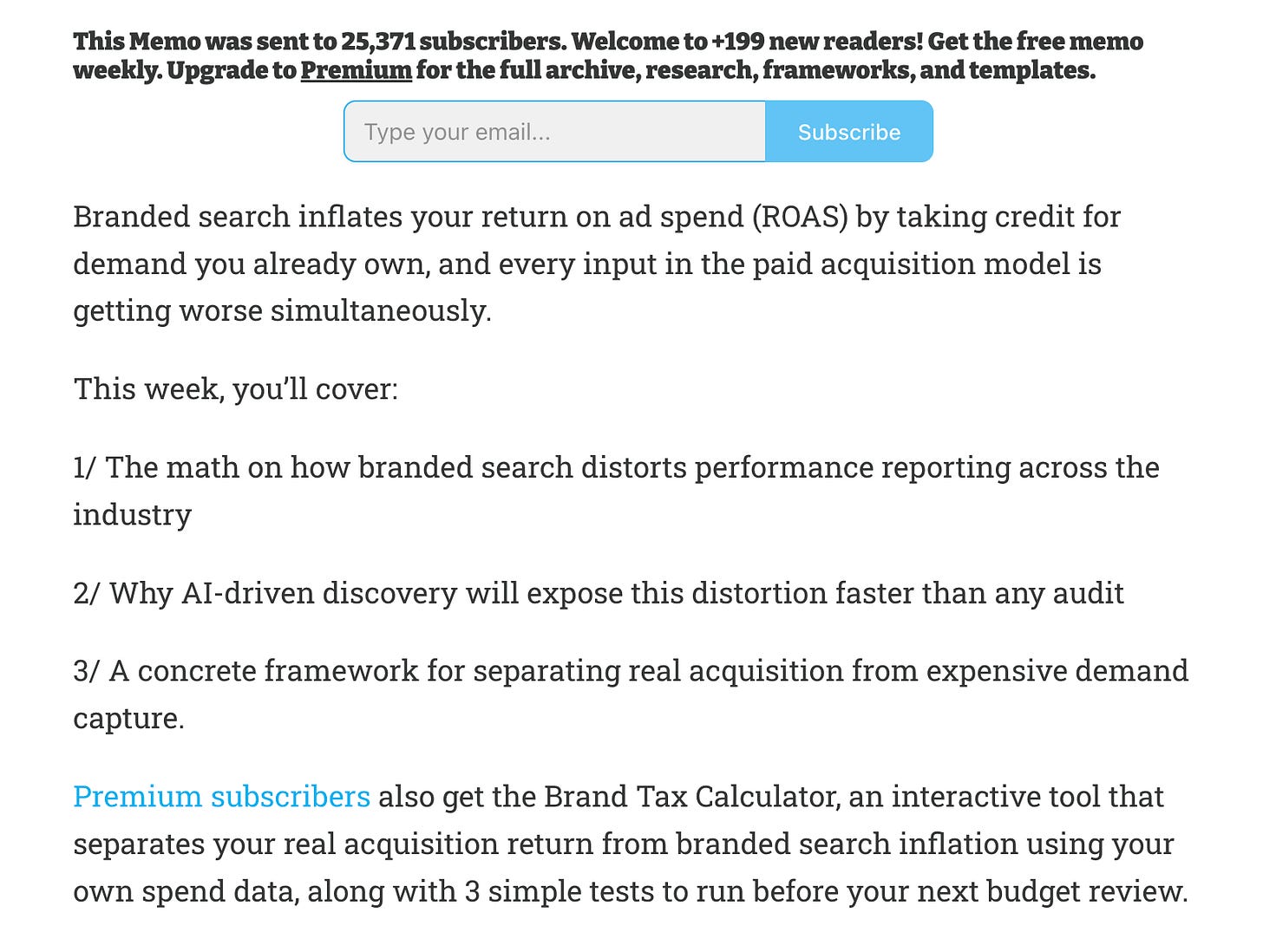 Growth Memo is a weekly, advanced growth newsletter focused on primary research and timely insights. Each issue typically follows the same intro structure: a themed header image, a one-line caption that restates the thesis, a short summary paragraph, a numbered preview of the issue's contents, a premium upsell line for paid subscribers, and a sponsored ad section before the main content begins. With that many moving parts, a template makes it much easier to keep everything straight and make sure nothing gets missed.
