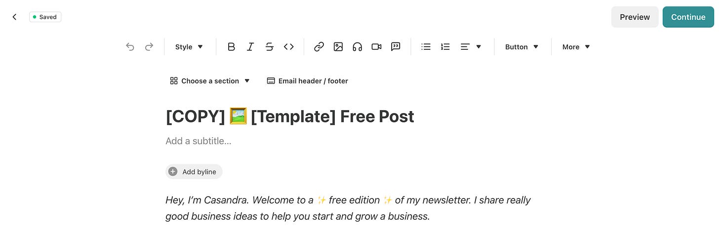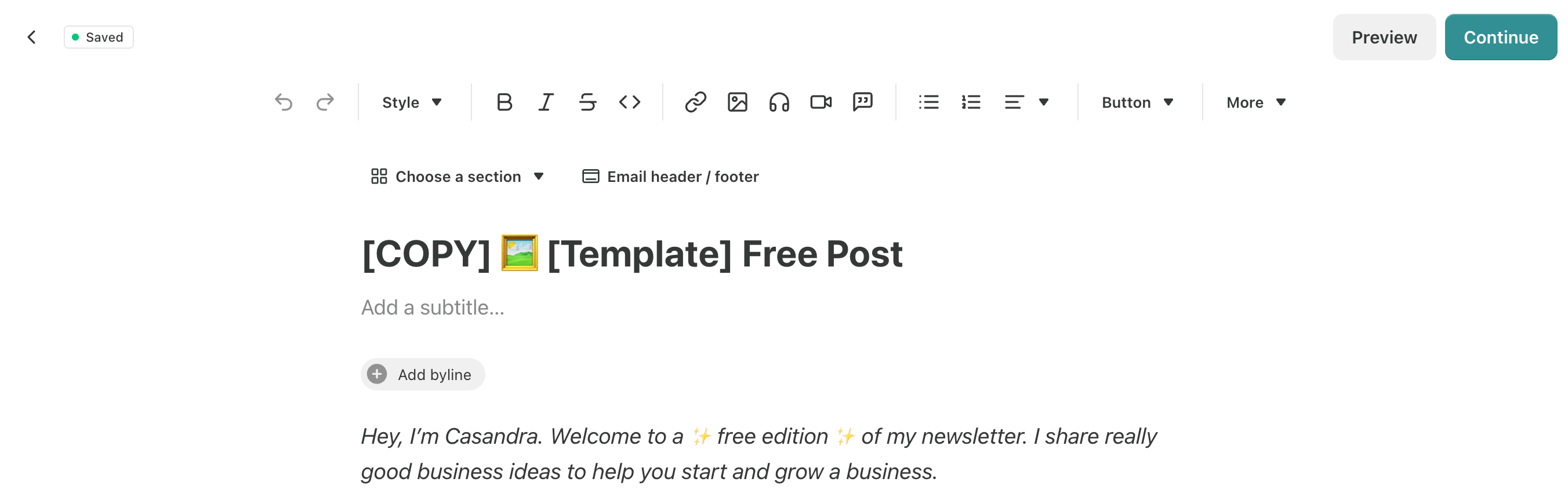 Create a new draft post. Add all the recurring elements you want in your template: header image or other visuals, section headings, rich content features, recurring copy, calls to action, subscribe buttons, dividers, whatever belongs in every post of that type. Build it out as if it were a real post, ready to publish.