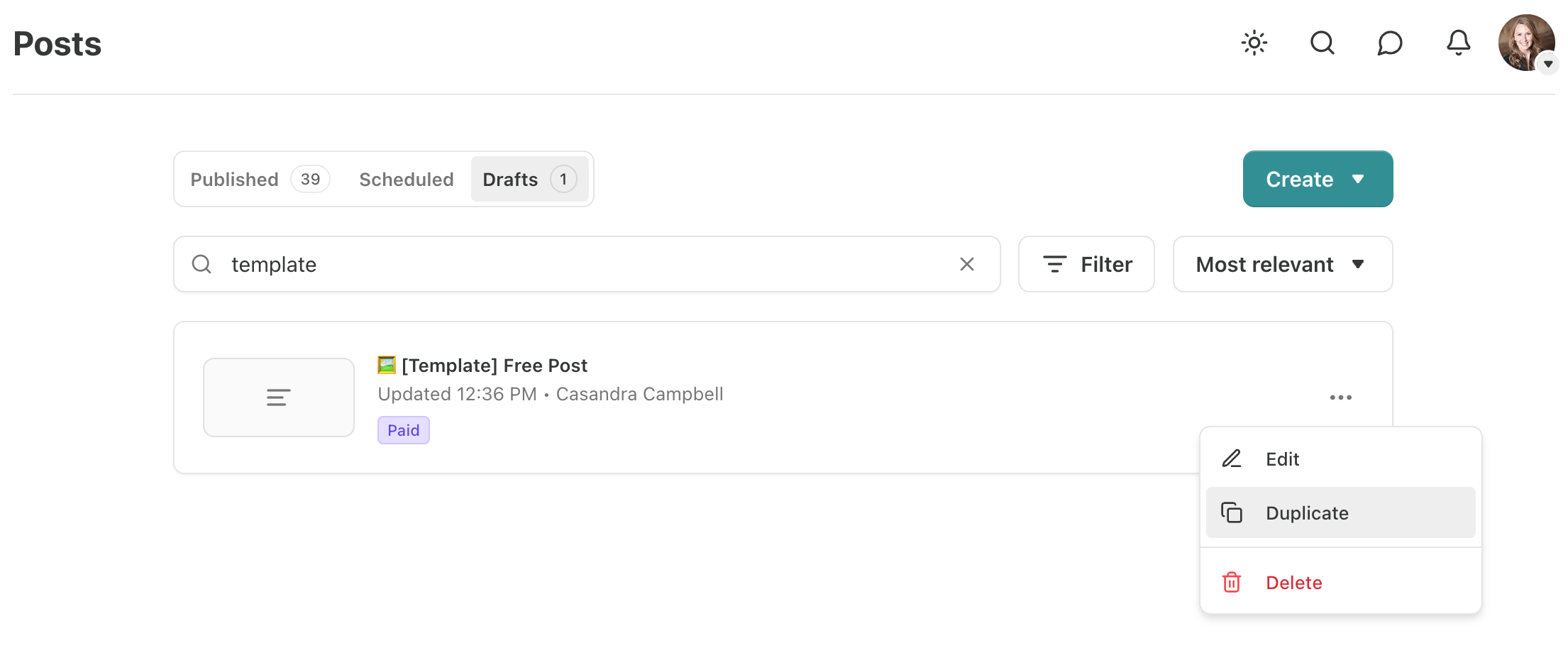 When you’re ready to write a new post, find your template draft and click the three dots next to the title. Select “Duplicate” from the drop-down menu.