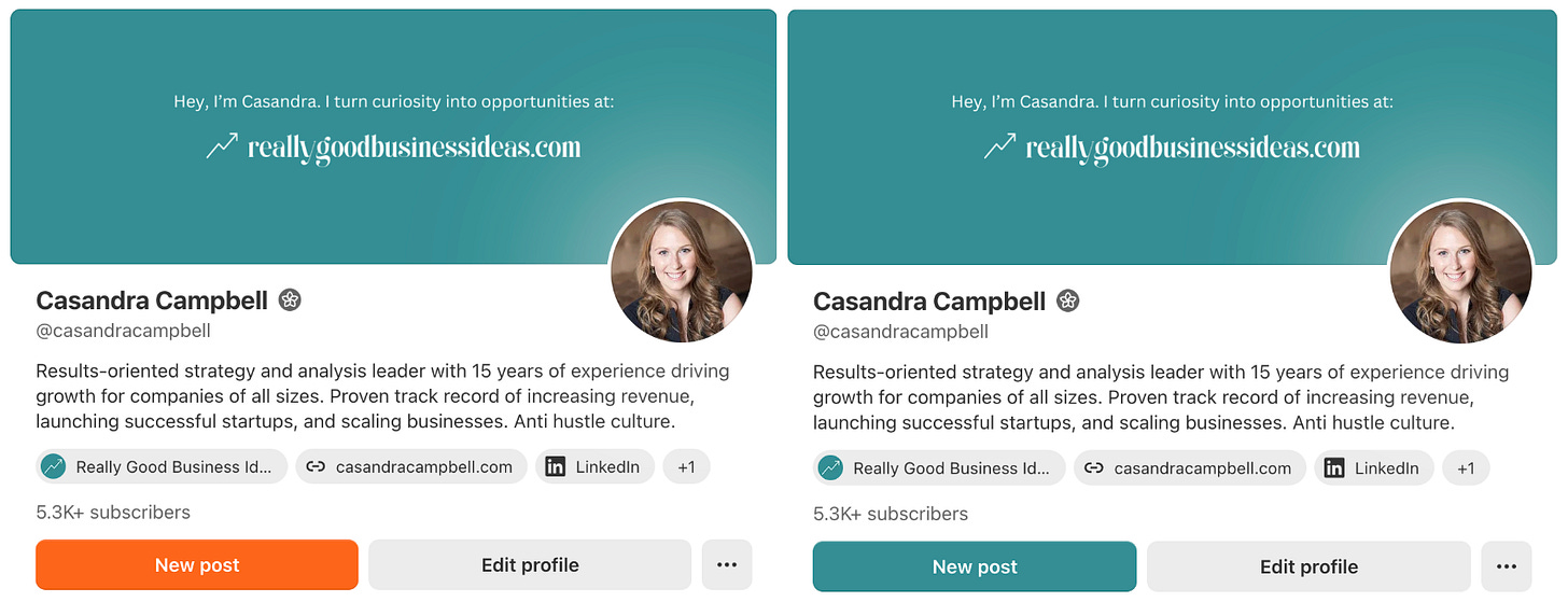You can change the accent color of your profile from the default Substack orange to one of dozens of other options. Since I found that my specific brand color (which I use in my publication’s design settings) was available as an option, I suspect the list of color choices is tailored to each profile.