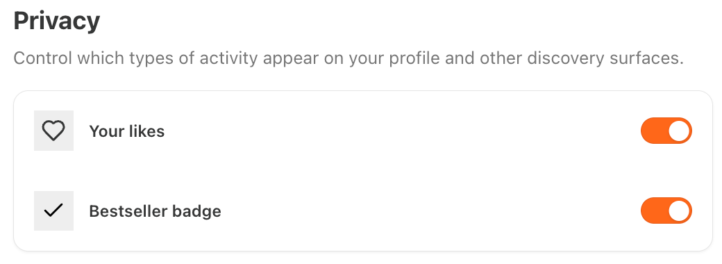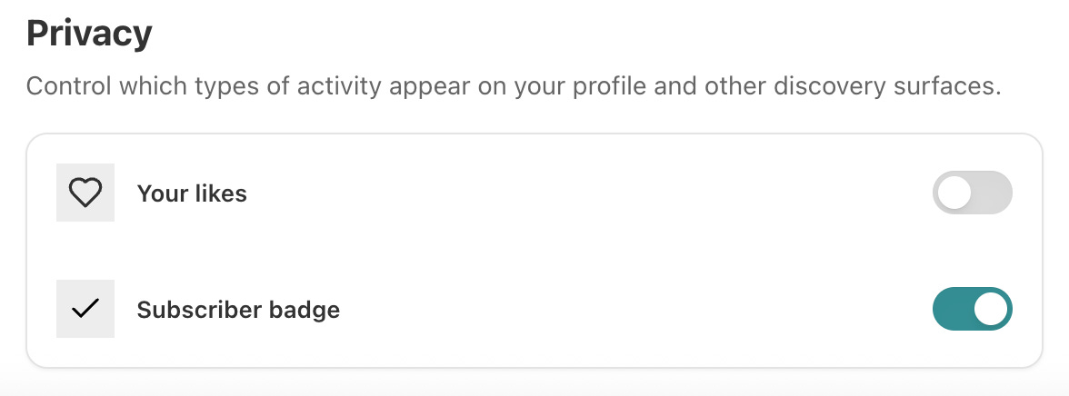 There are two types of badges on Substack that may be displayed on your profile, which you can choose to display (or not) using the toggle in the Privacy section of your edit profile page.
