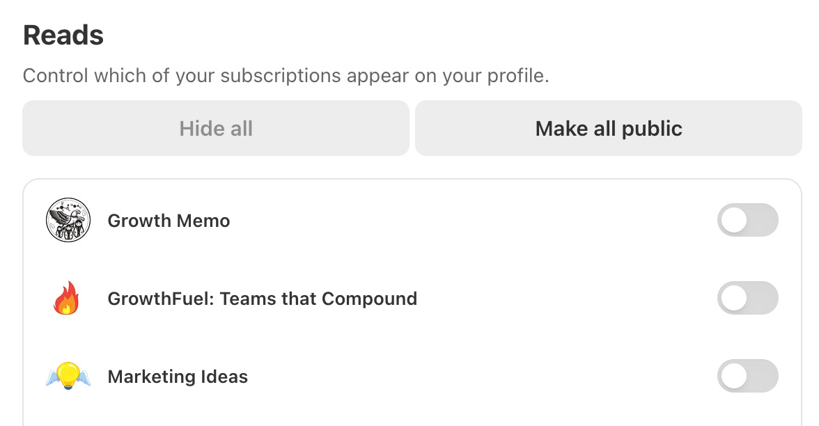 Make all public: Selecting this option will display all your subscriptions publicly, including future subscriptions. I generally recommend this for most people (at least when starting out), since it is a nice way to help visitors understand what you’re all about and to give visibility to the publications you support.