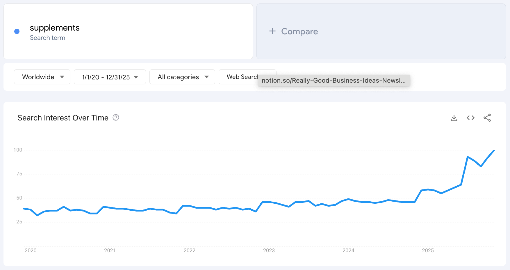 Search interest in supplements has been growing consistently over the last five years. At the start of each year, there’s a spike in searches, which then stabilizes and becomes the new normal. At the end of 2025, we saw the biggest jump yet.
