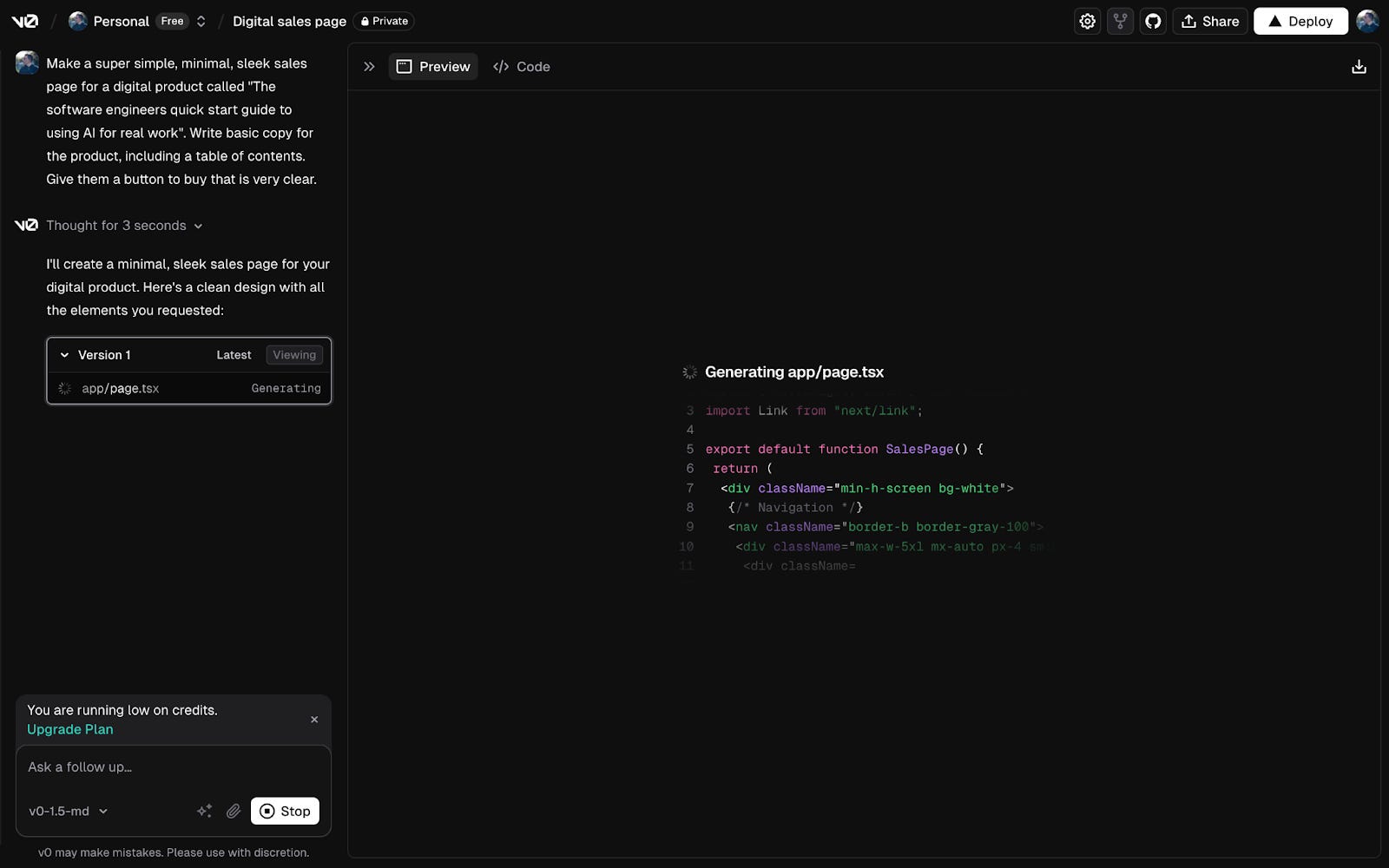 The great thing about using v0 is that all you have to do to get your project on the web is click “Deploy”. In less than ten minutes since I started, the sales page is already on the internet!