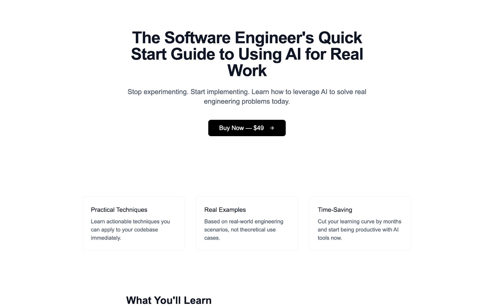 Make a super simple, minimal, sleek sales page for a digital product called "The software engineers quick start guide to using AI for real work". Write basic copy for the product, including a table of contents. Give them a button to buy that is very clear..V0 will do some reasoning and then kick off the project.